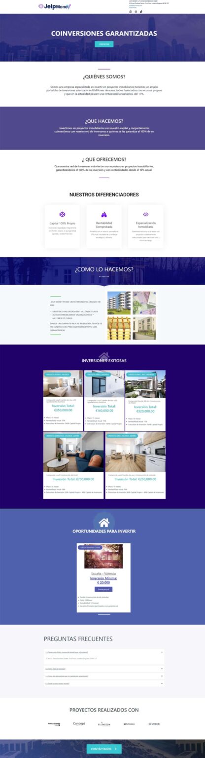 Rediseñamos la web del cliente para comunicar ofertas de inversión con claridad, confianza y conversión, integrando contacto directo, WhatsApp, correo corporativo y hosting